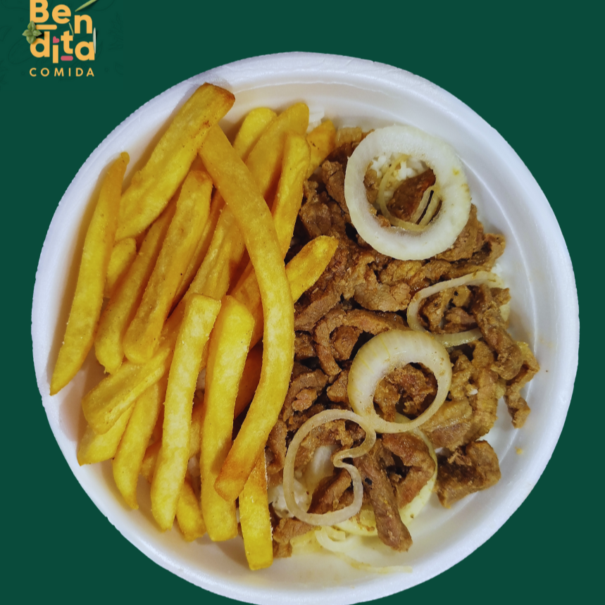 Marmita com deliciosas Iscas de Carne Acebolada acompanhada de Arroz Branco, Feijão E Batata Frita. Marmita indicada para 01 pessoa.