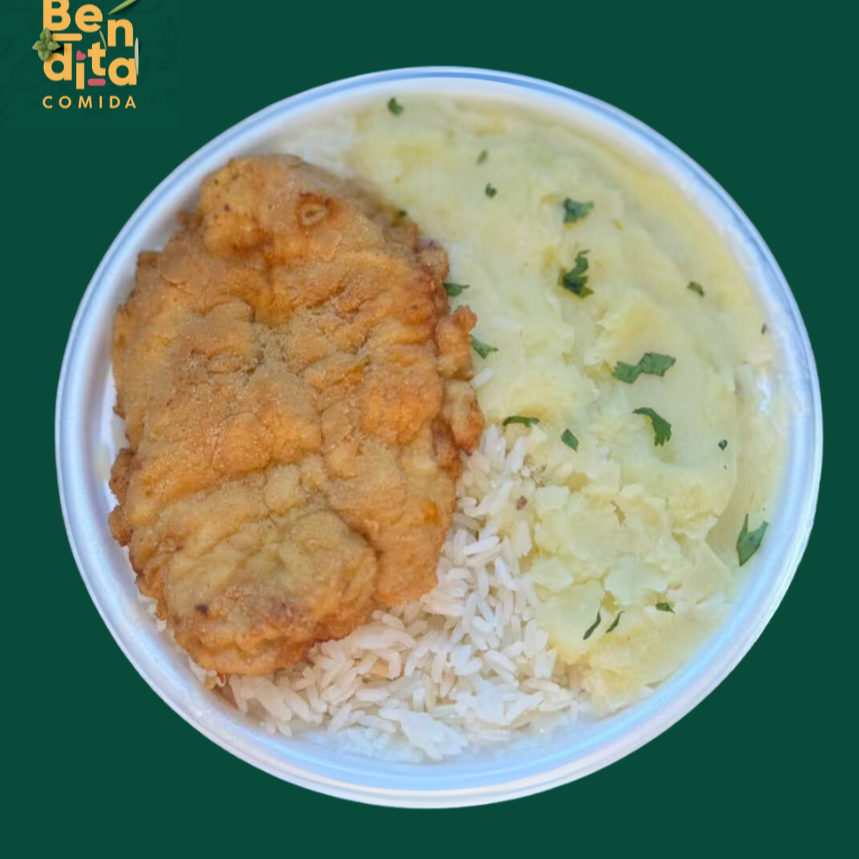 Marmita com delicioso filé de frango empanado na massa crocante acompanhado de arroz branco, feijão e purê de batatas. Marmita indicada para 01 pessoa.