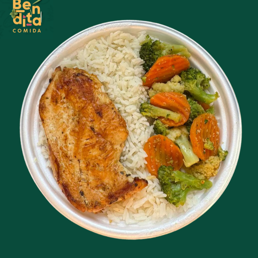 Marmita com delicioso filé de frango grelhado acompanhado de arroz branco, feijão e legumes cozidos. Marmita indicada para 01 pessoa.