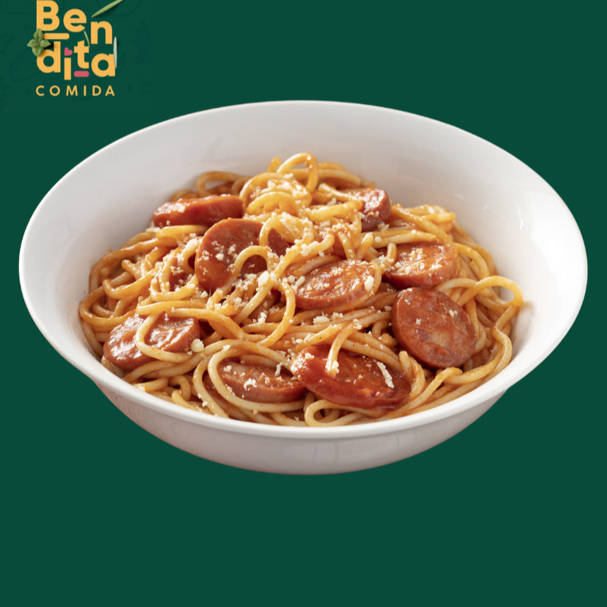 Aprecie o espaguete al dente, envolvido em um molho de tomate delicioso e recheado com pedaços de calabresa em cubos, que trazem um toque defumado e saboroso. Uma refeição simples e irresistível, cheia de sabor e carinho!
