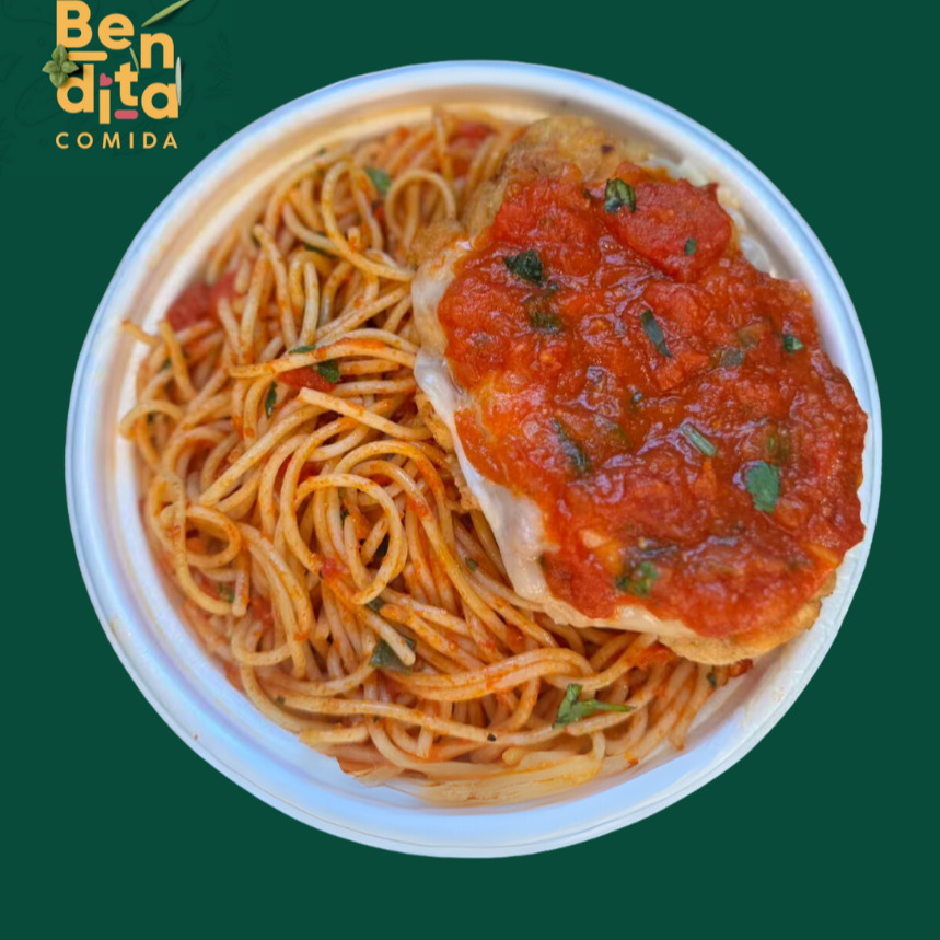Marmita com delicioso filé de frango parmegiana (empanado na massa crocante coberto com molho de tomates e queijo) acompanhado de macarrão espaguete ao molho de tomates. Marmita indicada para 01 pessoa.