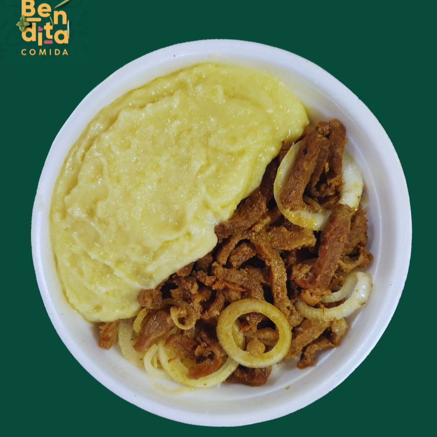 Iscas de carne acebolada, macias e saborosas, acompanhadas de arroz branco soltinho, feijão temperado e um purê de batatas cremoso. Uma refeição caseira e deliciosa, que combina o sabor intenso da carne com a suavidade do purê e o tempero do feijão, garantindo uma experiência completa e reconfortante.