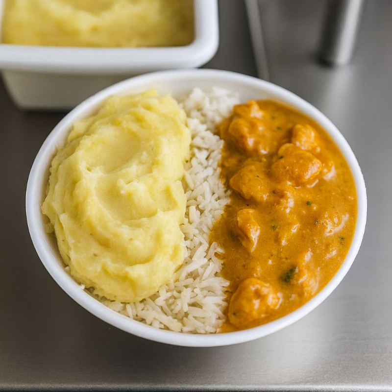 Strogonoff de frango acompanhado de Arroz branco e Purê de batata caseiro. (aprox. 750ml)