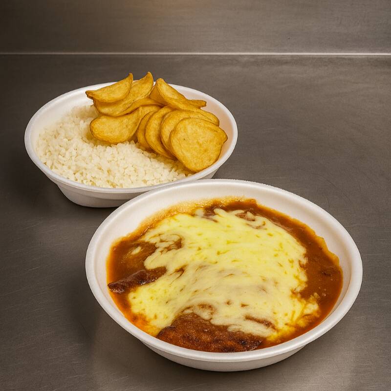Parmegiana de Frango: Acompanhado de Arroz e Batata Chips crocante
