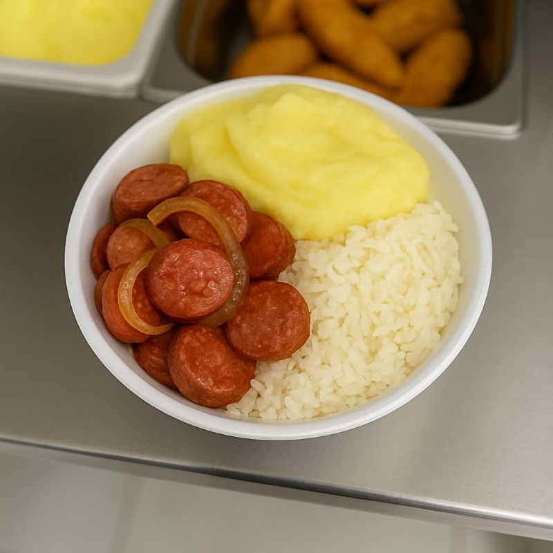 Calabresa acebolada acompanhada de arroz, feijão e purê de batata caseiro (aprox. 750ml)