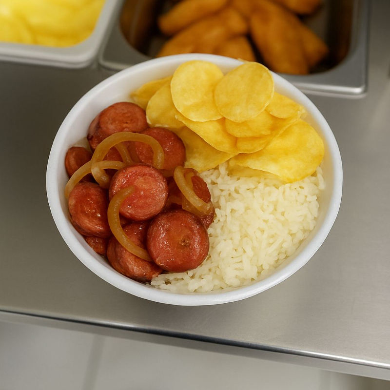 Calabresa acebolada: Acompanhada de arroz, feijão e batata frita chips (aprox. 750ml)