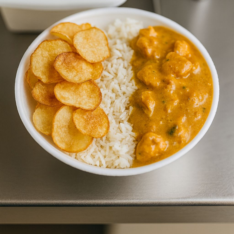 Strogonoff de Frango Acompanhado de Arroz e Batata Frita chips (aprox. 750ml )