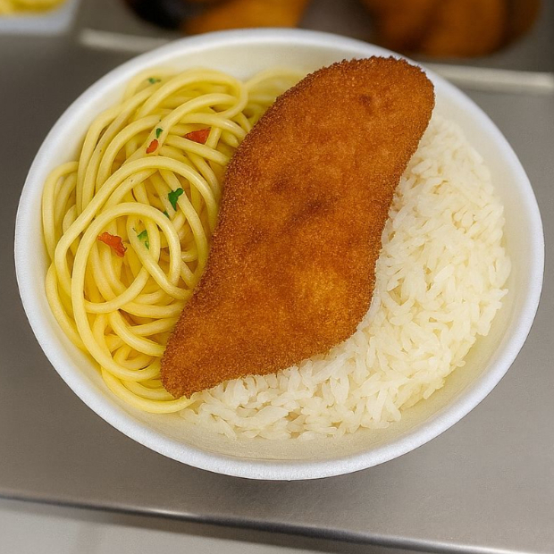 Frango Empanado: Acompanhado de Arroz, feijão, Macarrão.