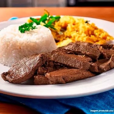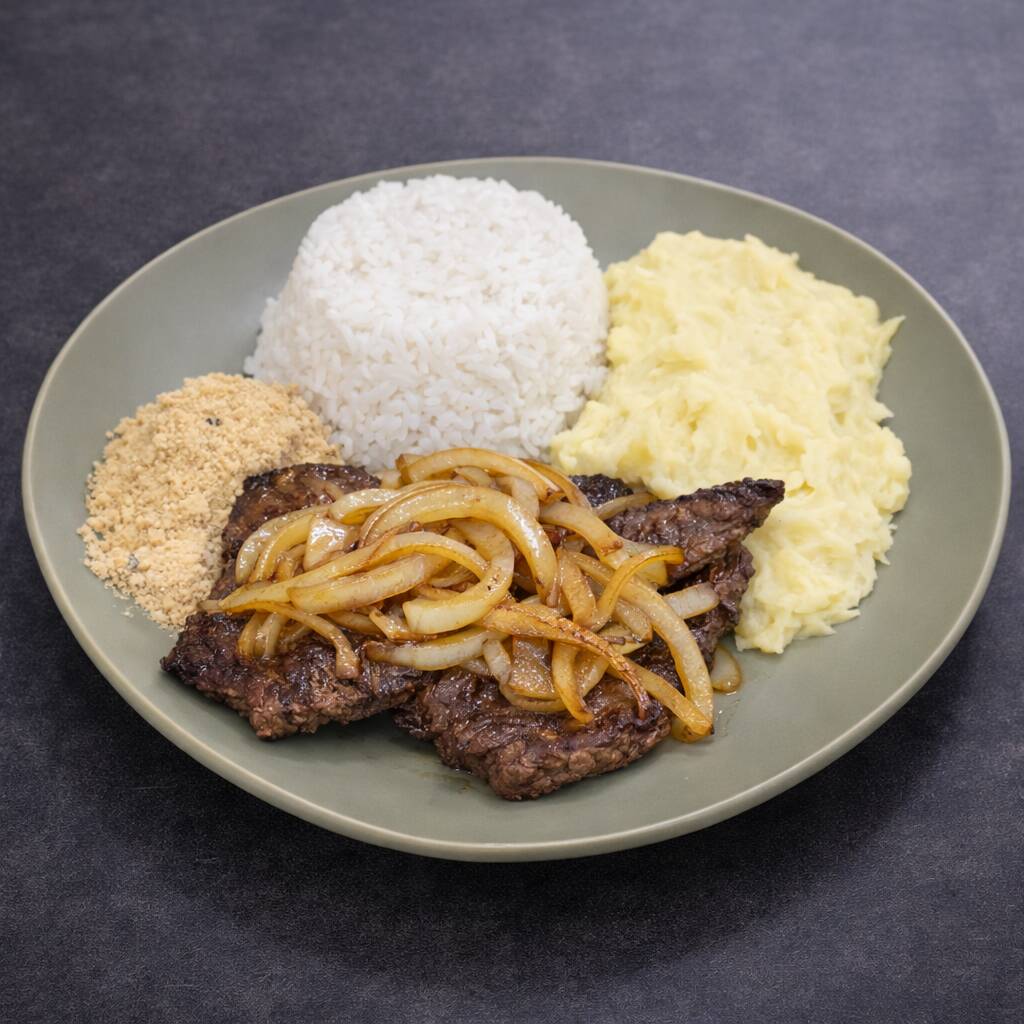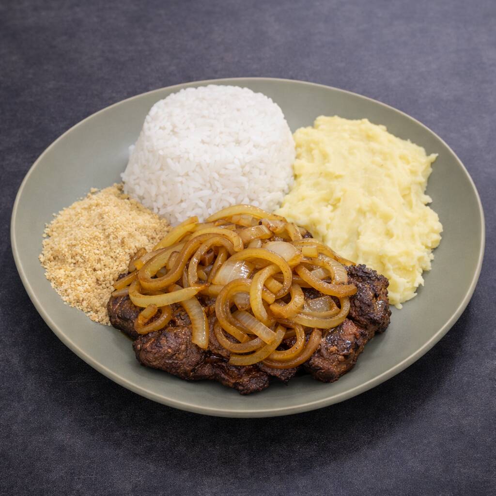 Fígado bovino grelhado e bem temperado, servido com arroz branco soltinho, purê de batata cremoso e farofa crocante. Acompanha purê por padrão, mas você pode trocar pelo feijão se preferir.