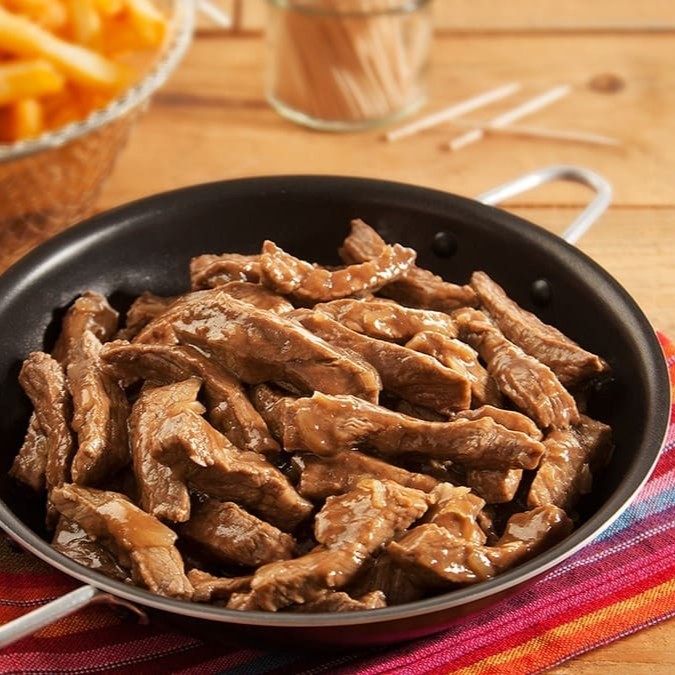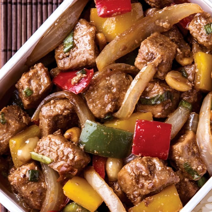Carne Xadrez: Deliciosos cubos de Filé Mingnon temperados preparados com cubos de cebolas e cubos de pimentões coloridos, finalizado com um molho especial a base de shoyu e com amendoim sem casca. Essa maravilha vai acompanhada de uma porção de arroz branco frito no alho e óleo. Uma delicia de prato.