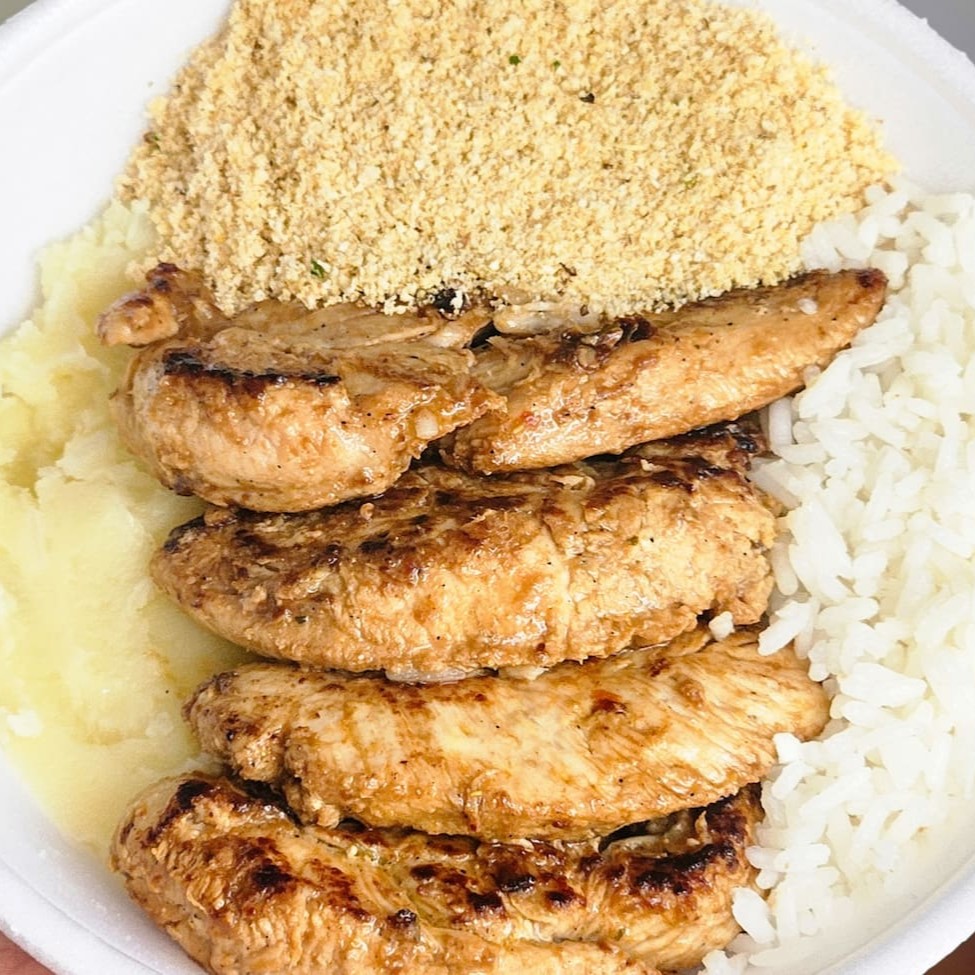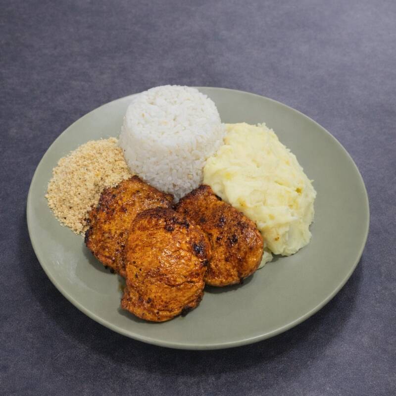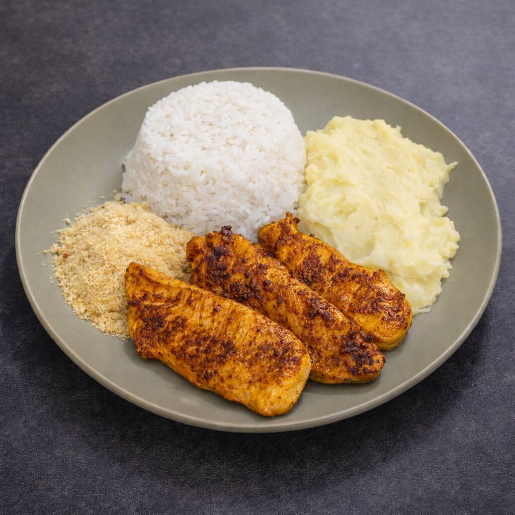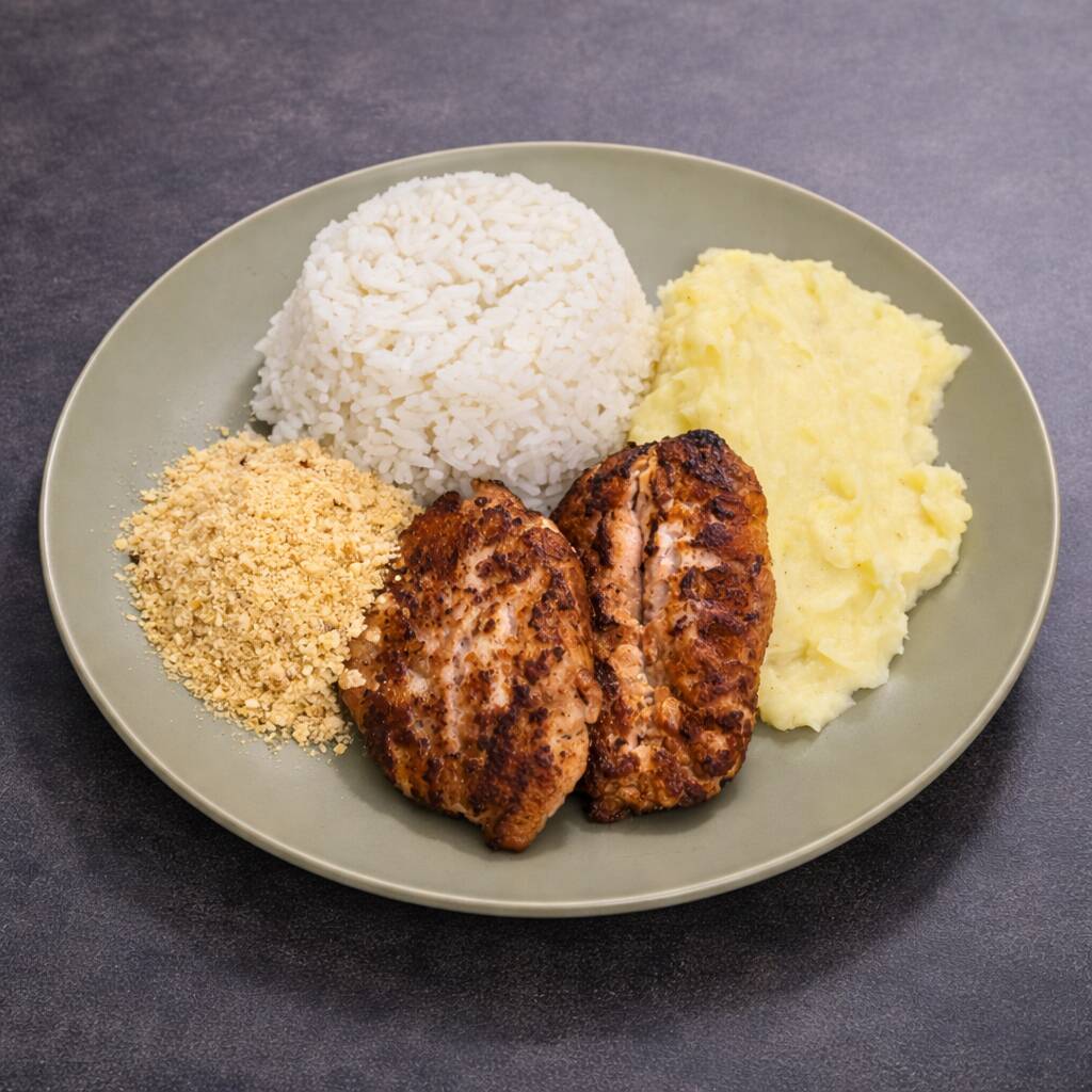 Delicioso peito de frango grelhado, servido com arroz branco soltinho, purê de batata cremoso e farofa crocante. Acompanha purê por padrão, mas você pode trocar pelo feijão se preferir.