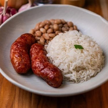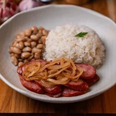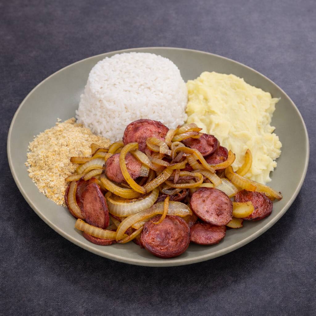 Calabresa grelhada no ponto certo, servida com arroz branco soltinho, purê de batata cremoso e farofa crocante. Acompanha purê por padrão, mas você pode trocar pelo feijão se preferir.
