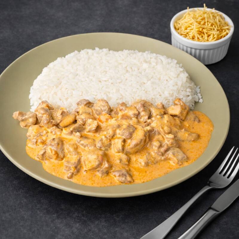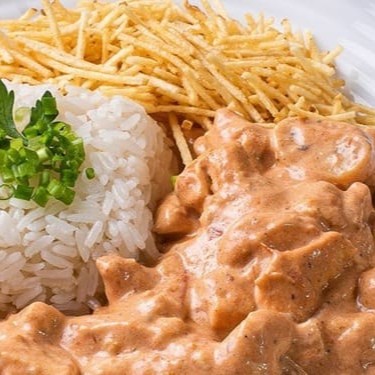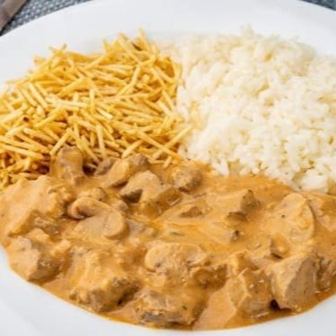 Delicioso Estrogonofe de Filé Mingnon acompanhado com Arroz Branco soltinho frito no Alho e Óleo e Batata Palha Crocante. Um prato de alta qualidade e sabor estravagante.