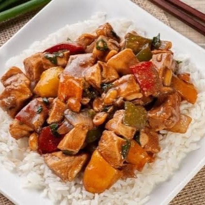 Frango Xadrez: Deliciosos cubos de frango temperados preparados com cubos de cebolas e cubos de pimentões coloridos, finalizado com um molho especial a base de shoyu e com amendoim sem casca. Essa maravilha vai acompanhada de uma porção de arroz branco soltinho preparado com tempero especial da casa.