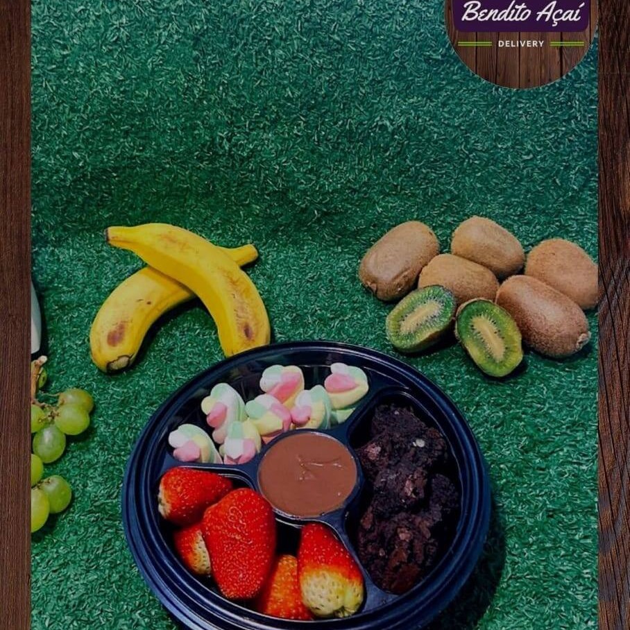 Açaí cremoso, kiwi, morango, granola e leite condensado.