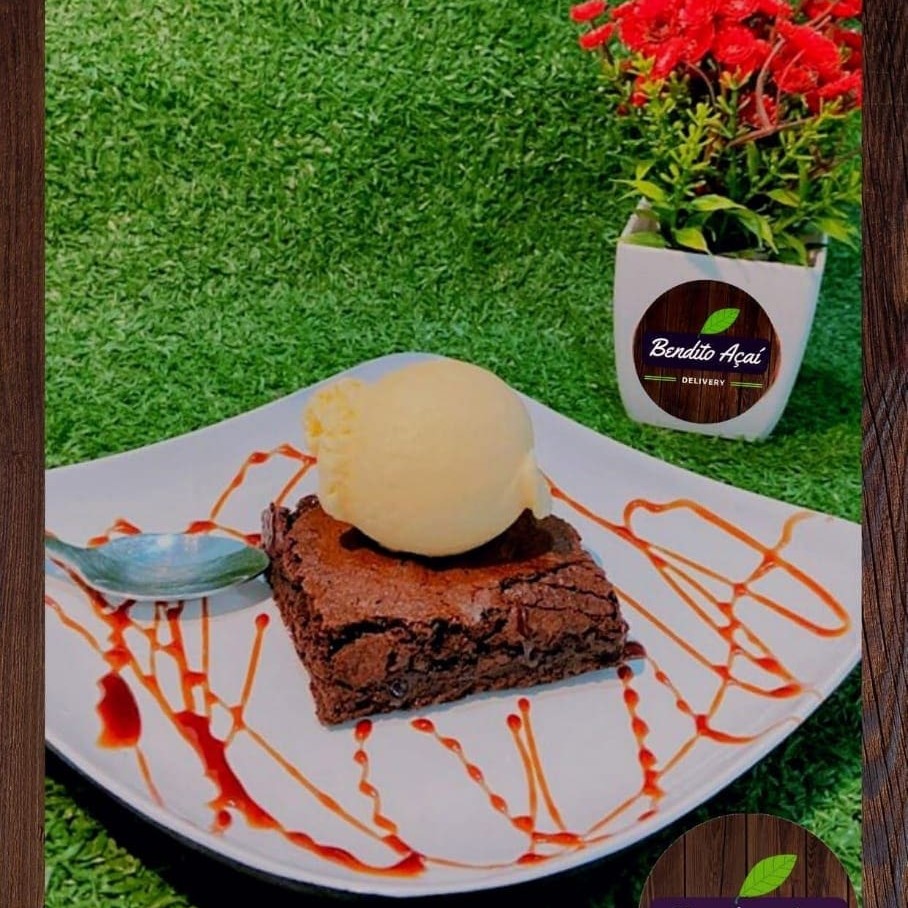 "O melhor e mais gostoso bendito ""brownie"" de chocolate acompanhado de fruta e sorvete da sua preferencia."
