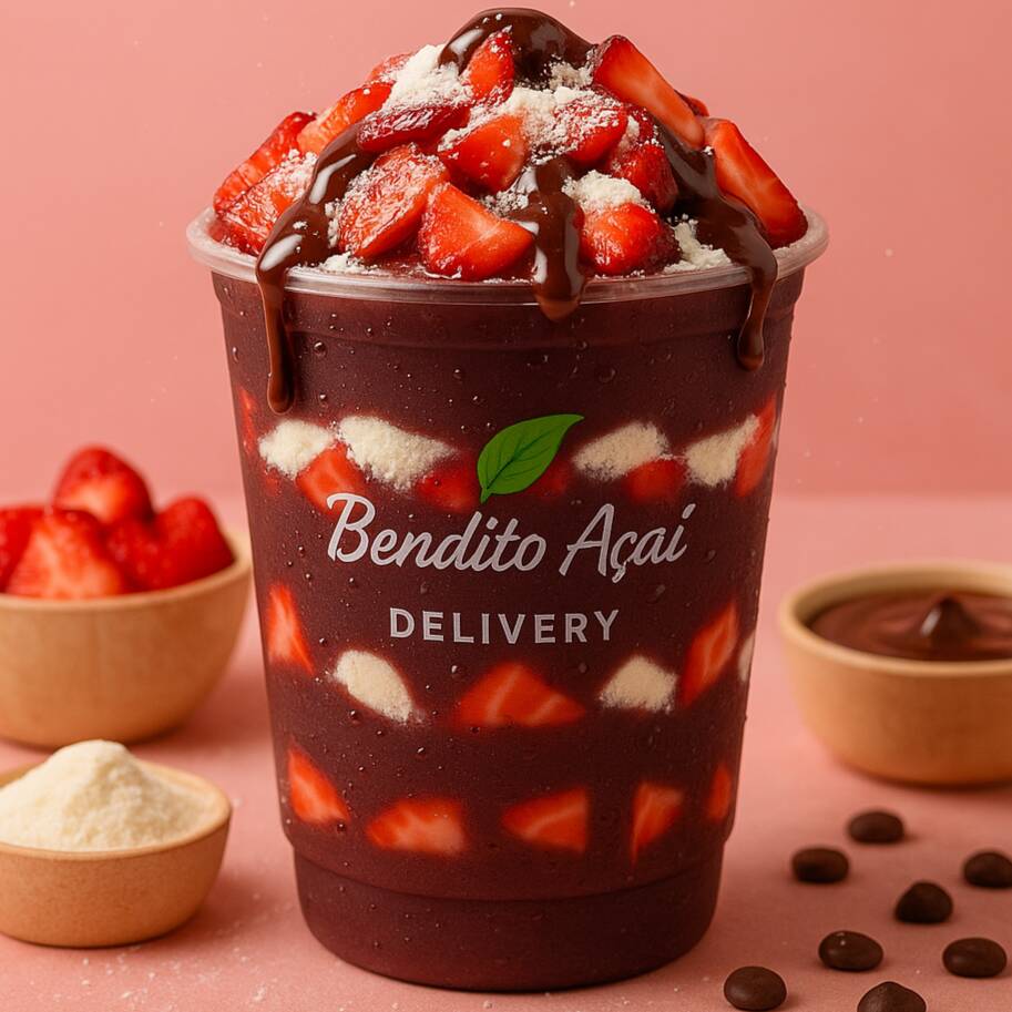 Açaí cremoso, morango, leite em pó e cobertura de chocolate