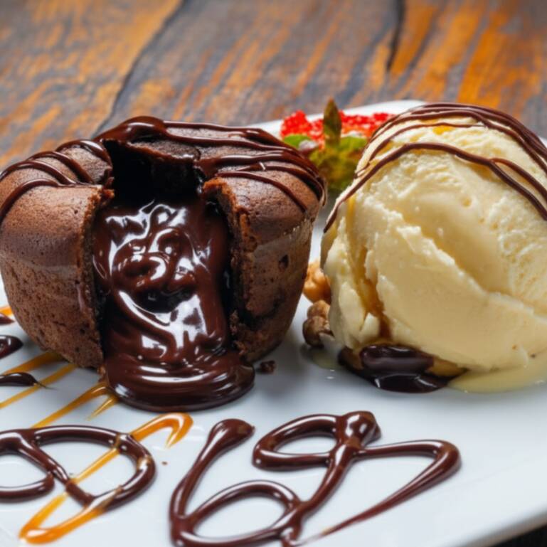 "O melhor e mais gostoso bendito ""petit gateau"" de chocolate acompanhado de fruta e sorvete da sua preferencia."