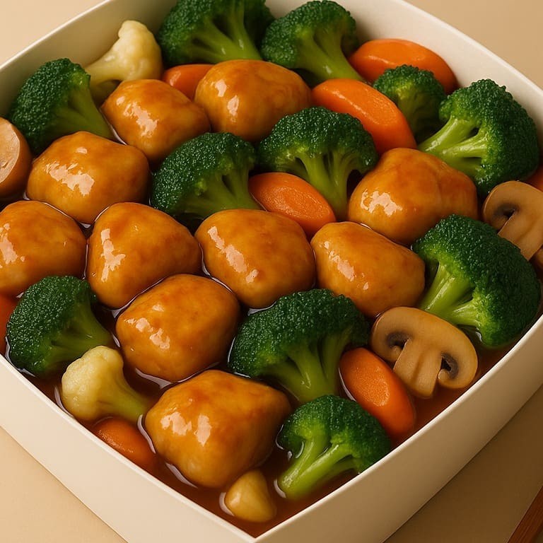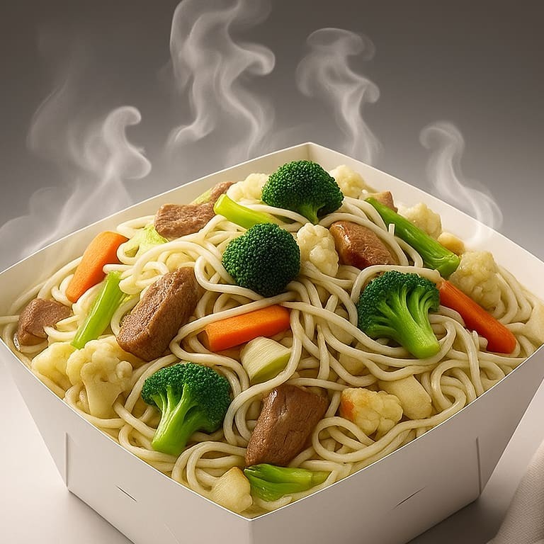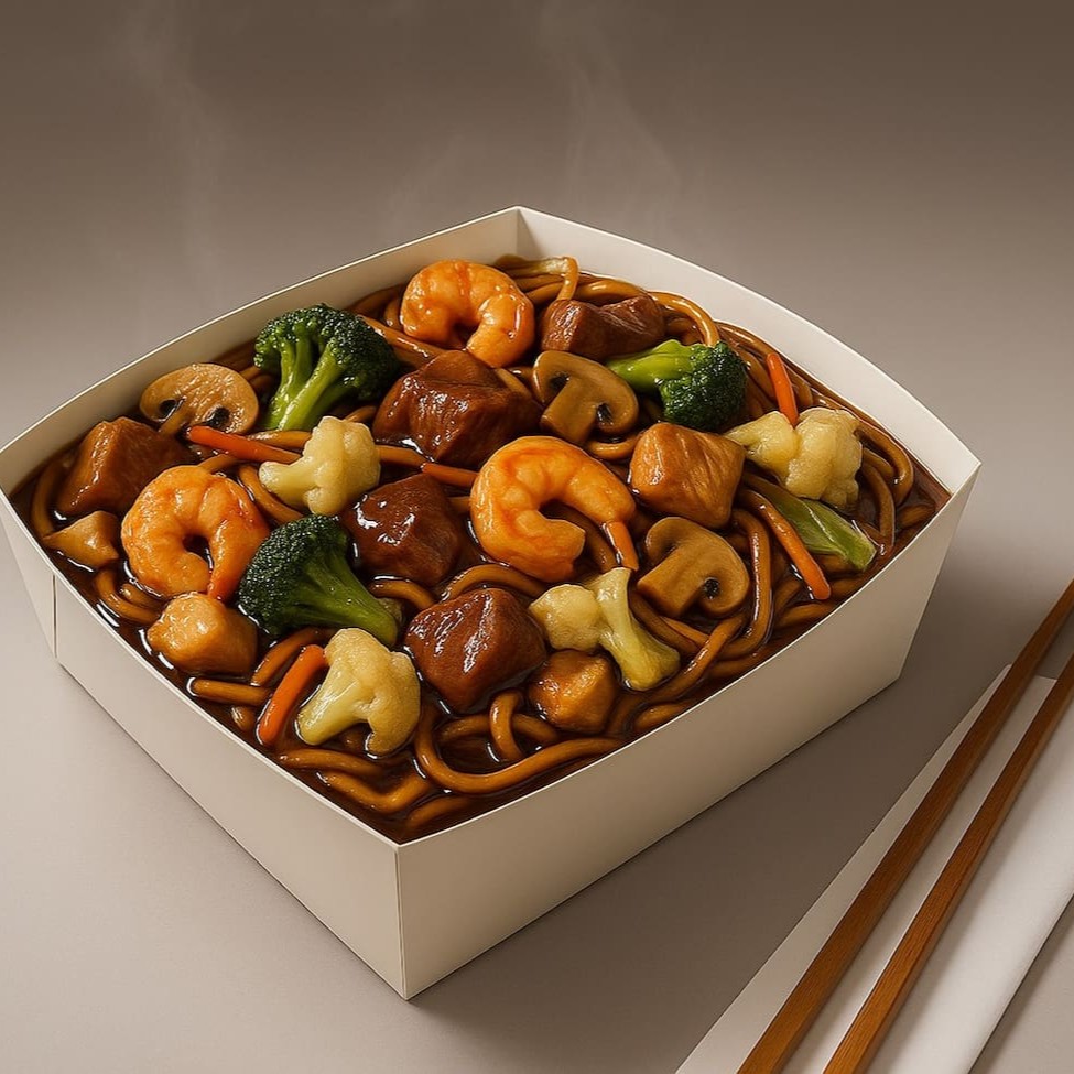 Uma combinação clássica e saborosa com carne bovina macia, frango suculento, acelga fresca, brócolis crocante, cenoura, couve-flor e repolho, todos salteados com um delicado macarrão fino de arroz. Um prato leve, saudável e cheio de sabor, ideal para quem busca uma refeição equilibrada e deliciosa.