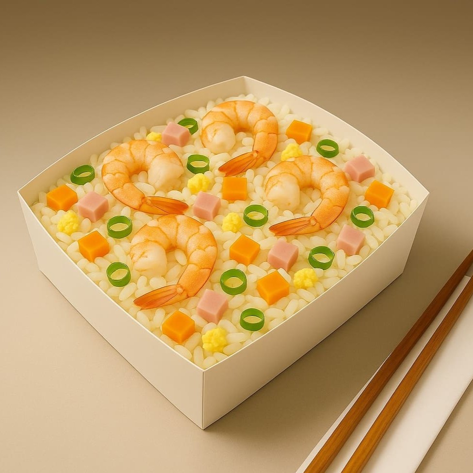 Arroz branco e soltinho em box, com camarões selecionados, cubinhos de presunto e cenoura, pedacinhos delicados de ovo e finalizado com cebolinha fresca. Uma versão colorida, harmoniosa e irresistível!
