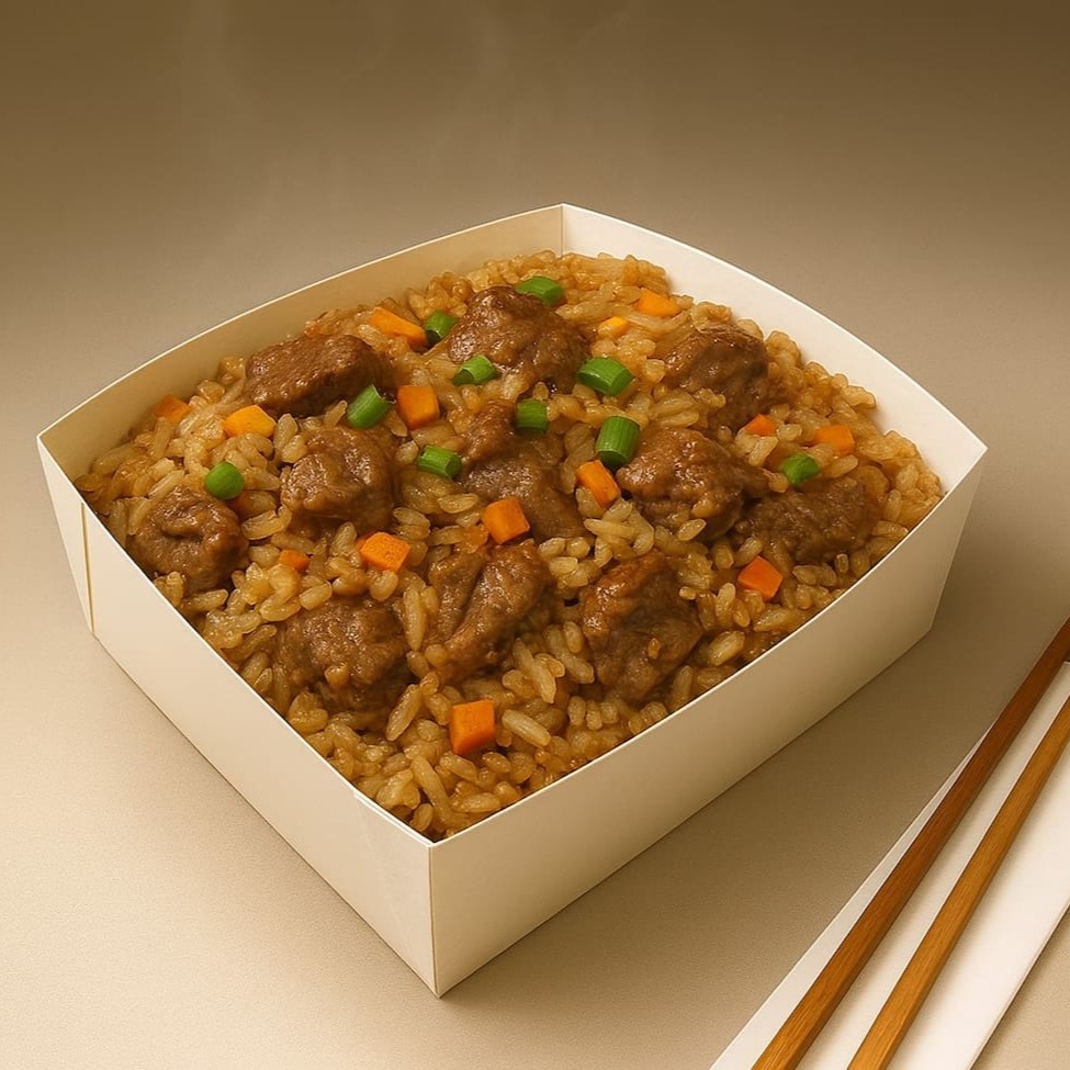 Arroz soltinho com tiras de carne bovina, cenoura em cubinhos, ovo em pedaços delicados e finalizado com cebolinha fresca. Tudo levemente temperado com molho shoyu, no melhor estilo.