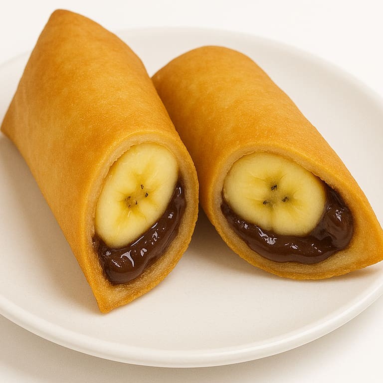 Rolinho crocante recheado com fatias de banana e chocolate derretido, formando uma combinação perfeita entre doçura e intensidade.