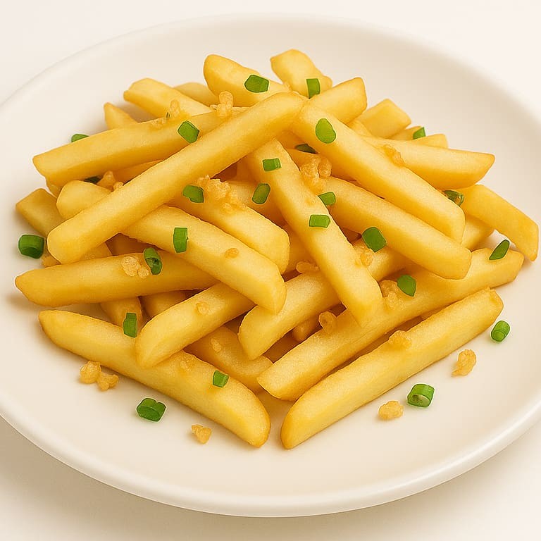 Batatas douradas e crocantes, salteadas no alho frito e finalizadas com cebolinha fresca, trazendo aroma e sabor irresistíveis.