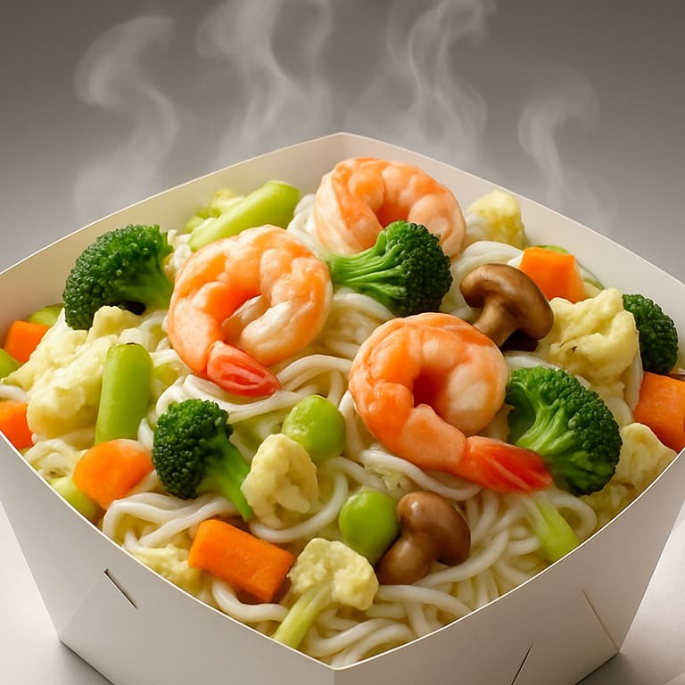 Uma explosão de sabor e leveza com camarões selecionados, acelga, brócolis, couve-flor, cenoura, repolho e champignon, envolvidos no delicado macarrão fino de arroz. Perfeito para quem aprecia frutos do mar frescos e vegetais crocantes em uma receita saudável, colorida e irresistível!