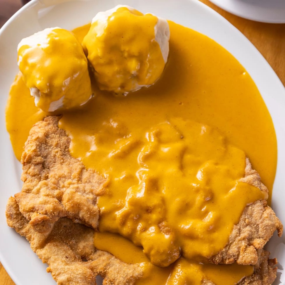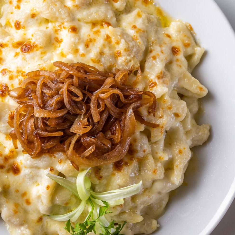 Filé mignon à milanesa ao molho páprica, bolinho de pão e spätzle. Serve 2 pessoas.