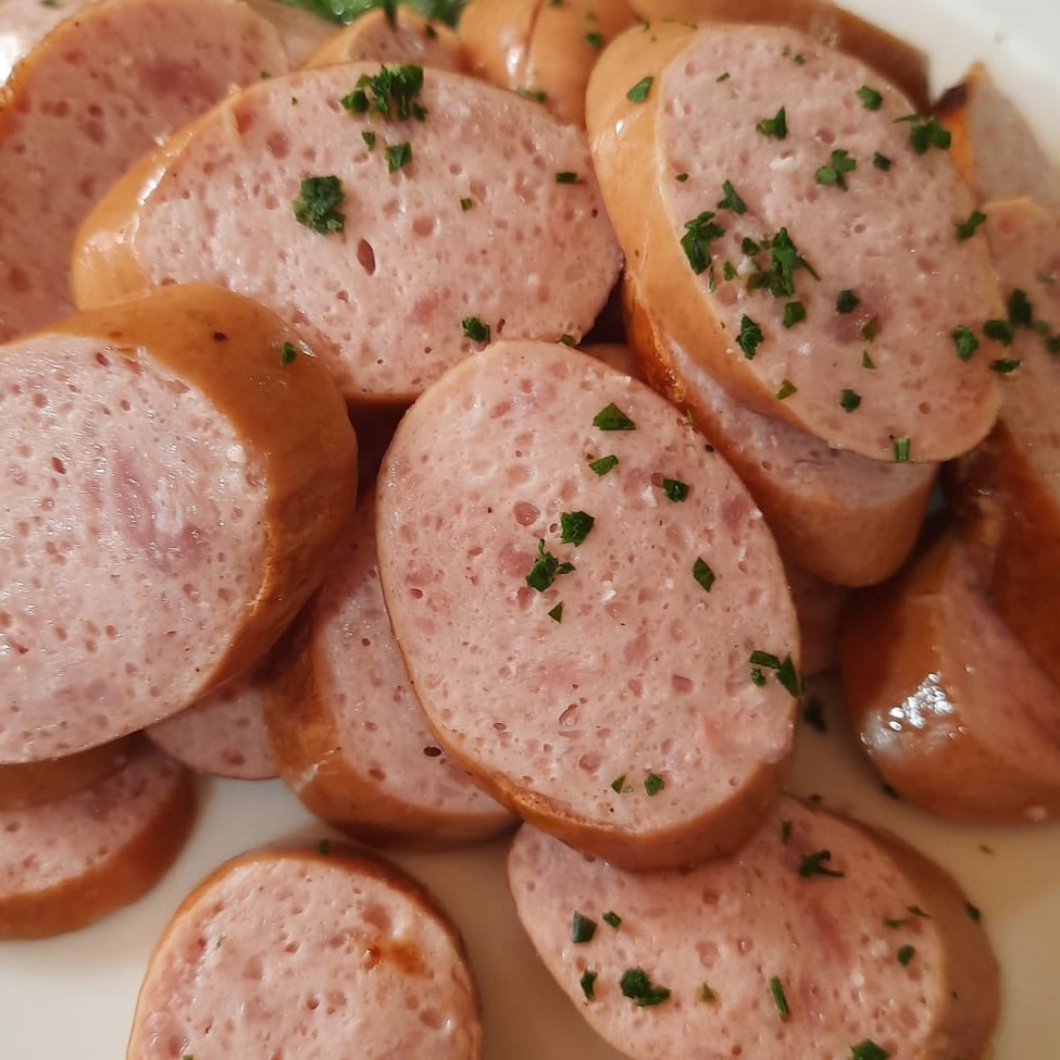 Duas unidades de salsicha branca de vitelo fatiada.