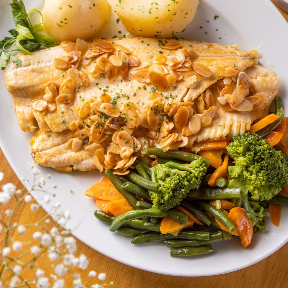 Filé de truta grelhada com amêndoas, legumes no vapor e batata cozida. Serve 2 pessoas.