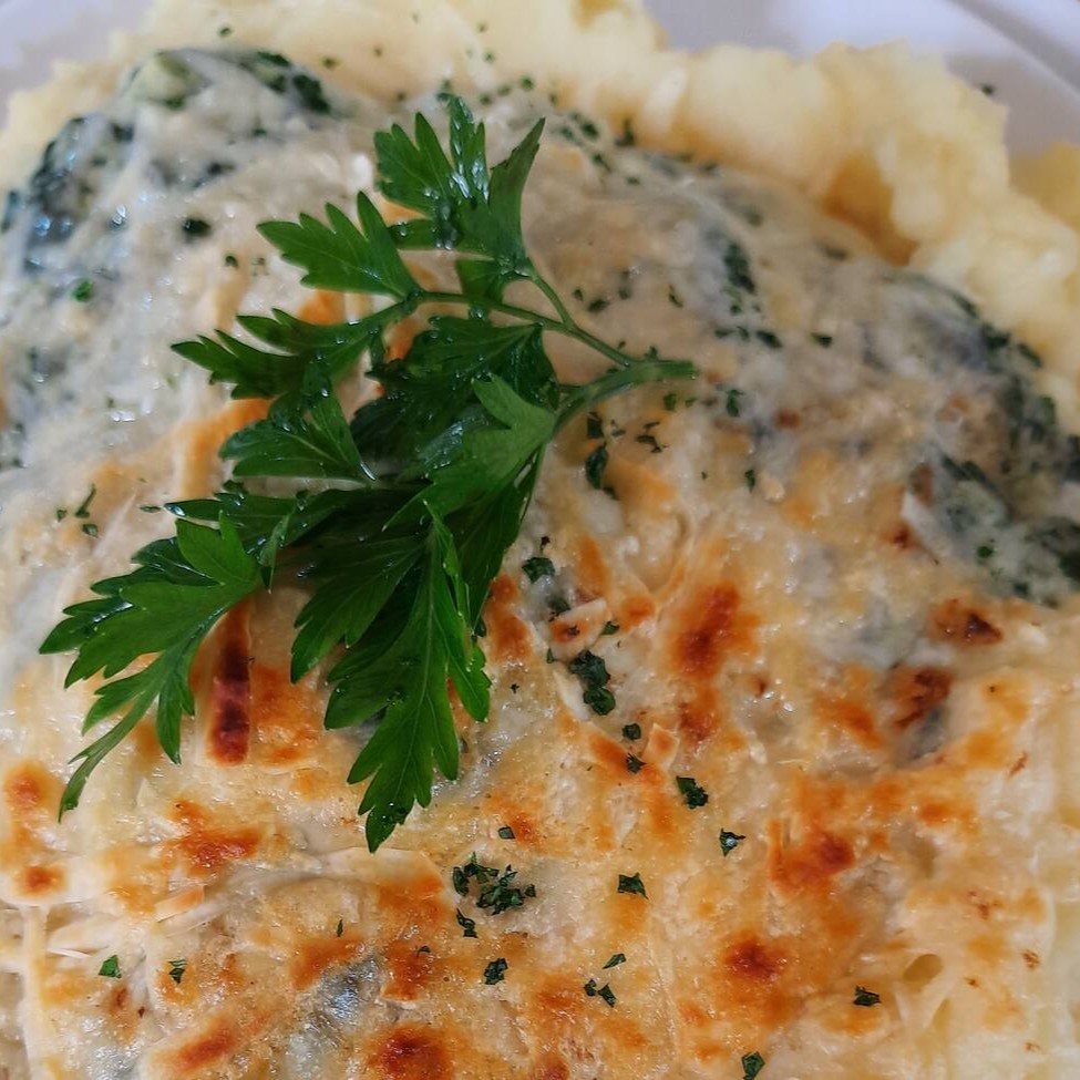 Linguado grelhado com purê, creme de espinafre e gratinado com parmesão. Serve 2 pessoas.