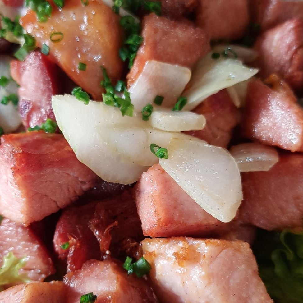 Bisteca defumada alemã em cubos frita aperitivo