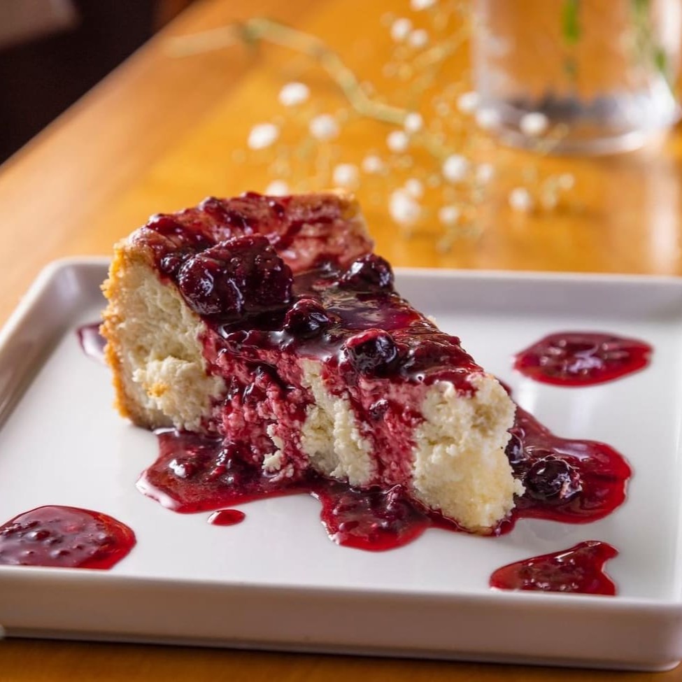 Bolo de queijo alemão com calda de frutas vermelhas