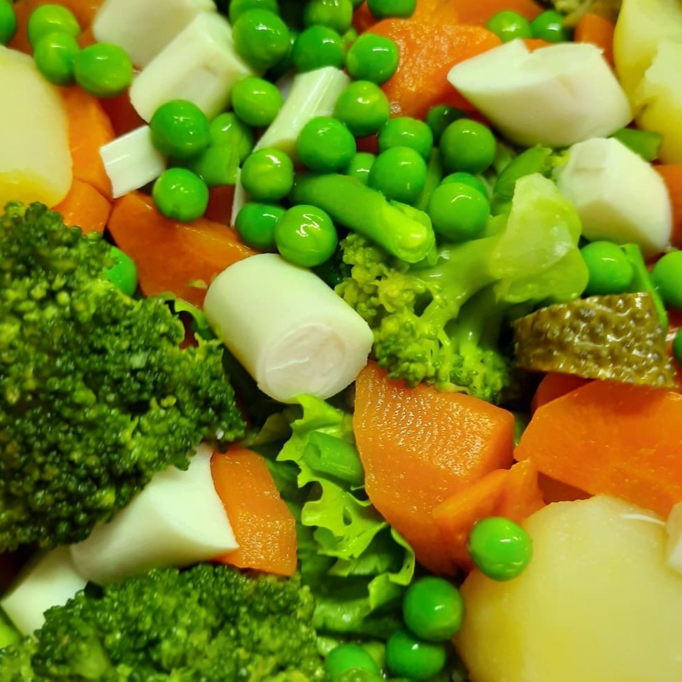 Salada de folhas verdes, tomate, palmito fatiado, ervilha, batata, brócolis, cenoura, vagem, presunto e queijo.