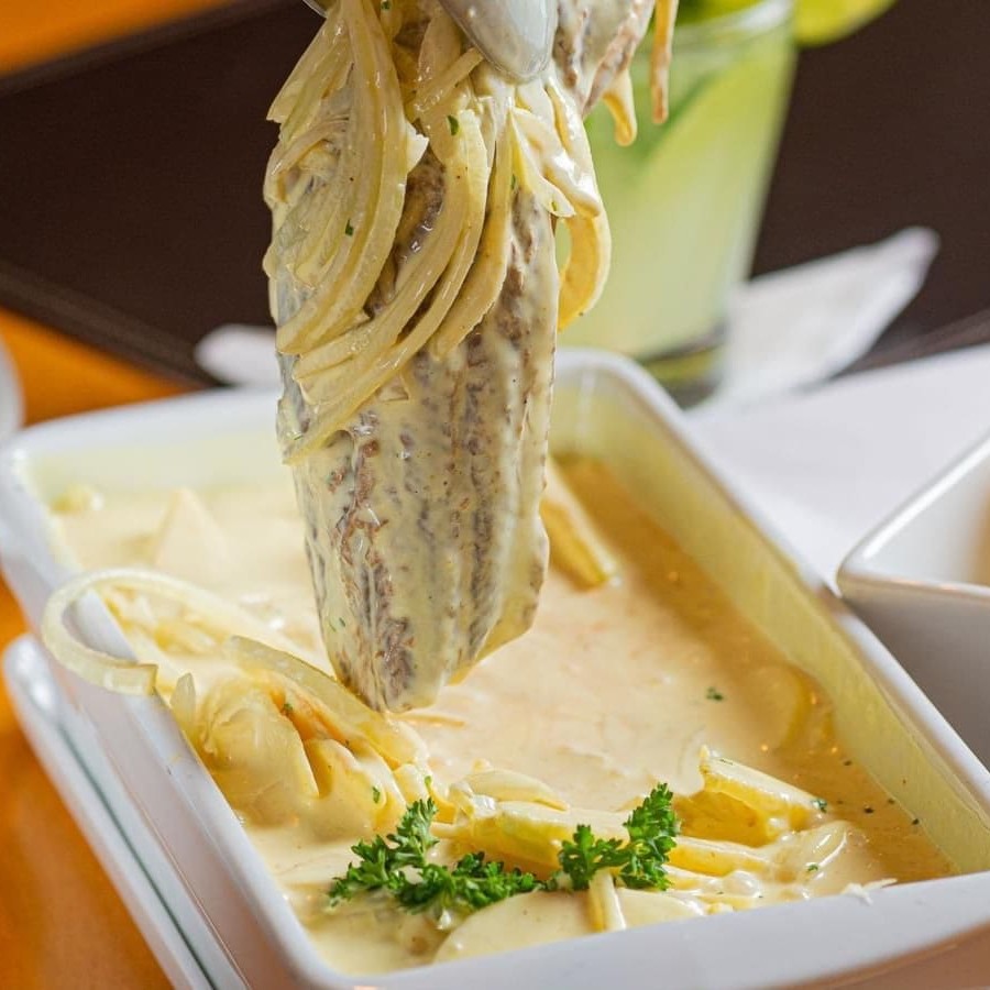 Filé mignon à milanesa com purê de batatas e gratinado com molho branco e mussarela. Serve 2 pessoas.