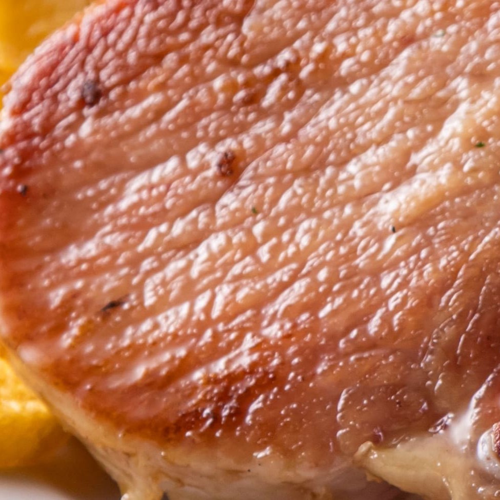 1 unidade de bisteca de porco grelhada servido com repolho roxo e batata dourada.