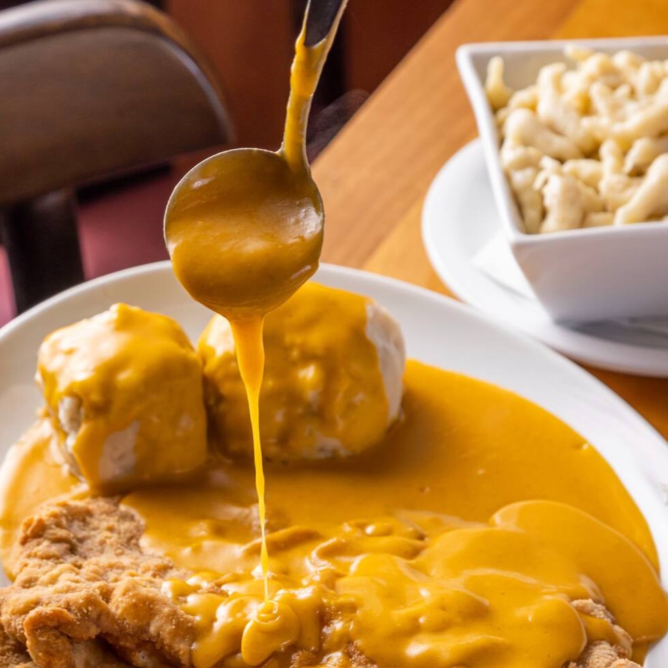 Escalope de Porco à milanesa ao molho páprica, knoedel -bolinho de pão e spätzle. Serve 2 pessoas.