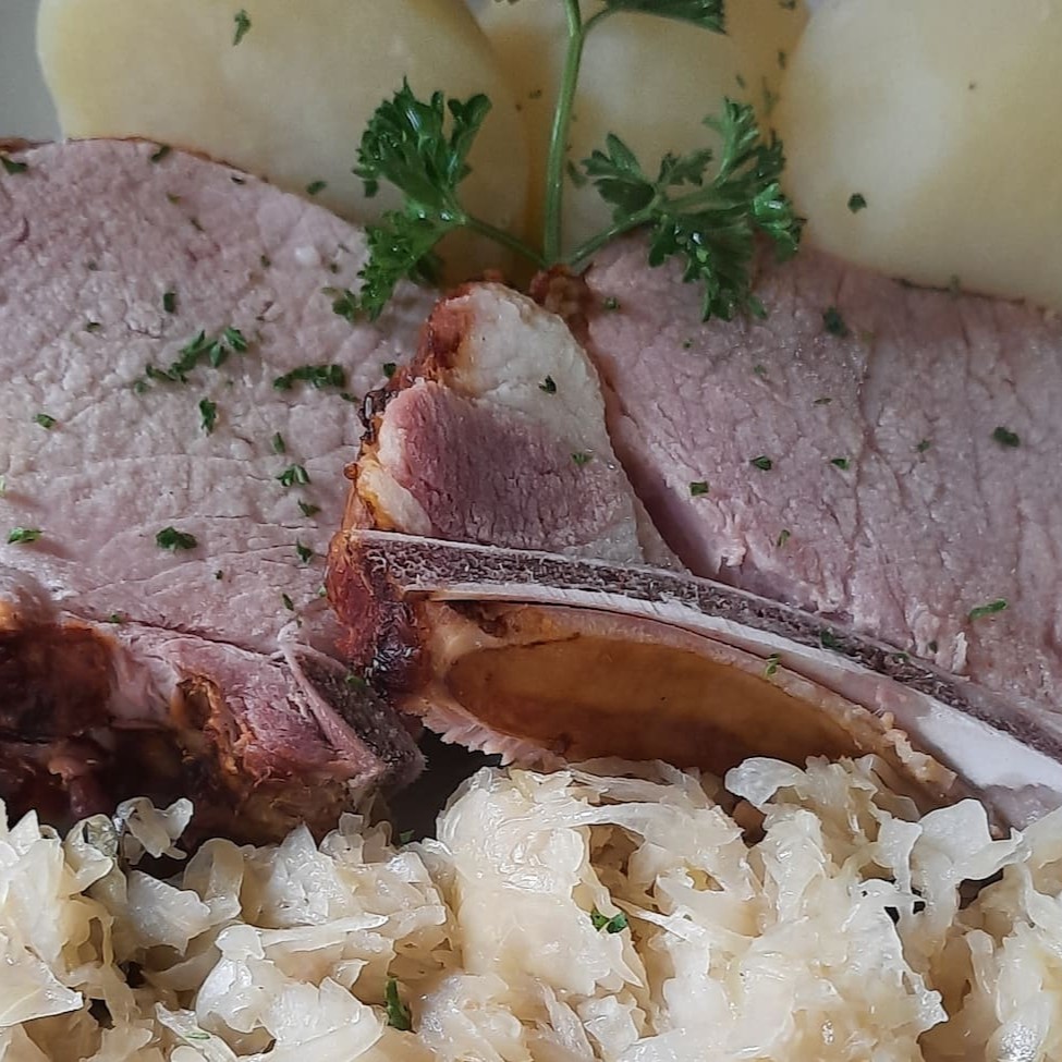 2 unidades de bisteca de porco cozida servido com chucrute e batata cozida. Serve 2 pessoas.