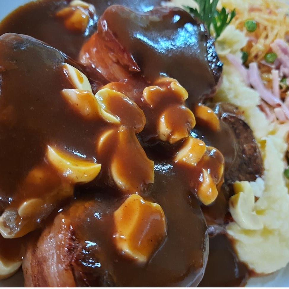 Filé mignon ao molho madeira e champignons servido com purê de batatas