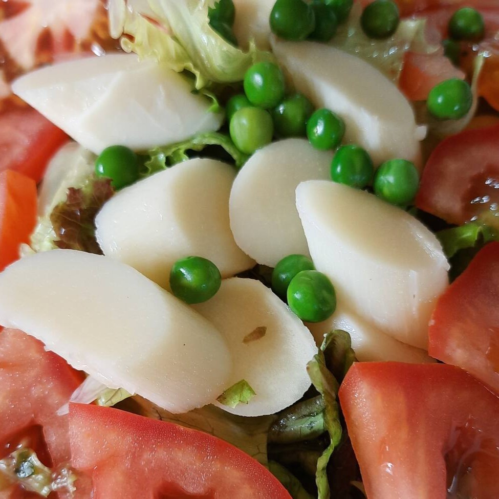 Salada de folhas verdes, tomate fatiado, palmito e ervilha.
