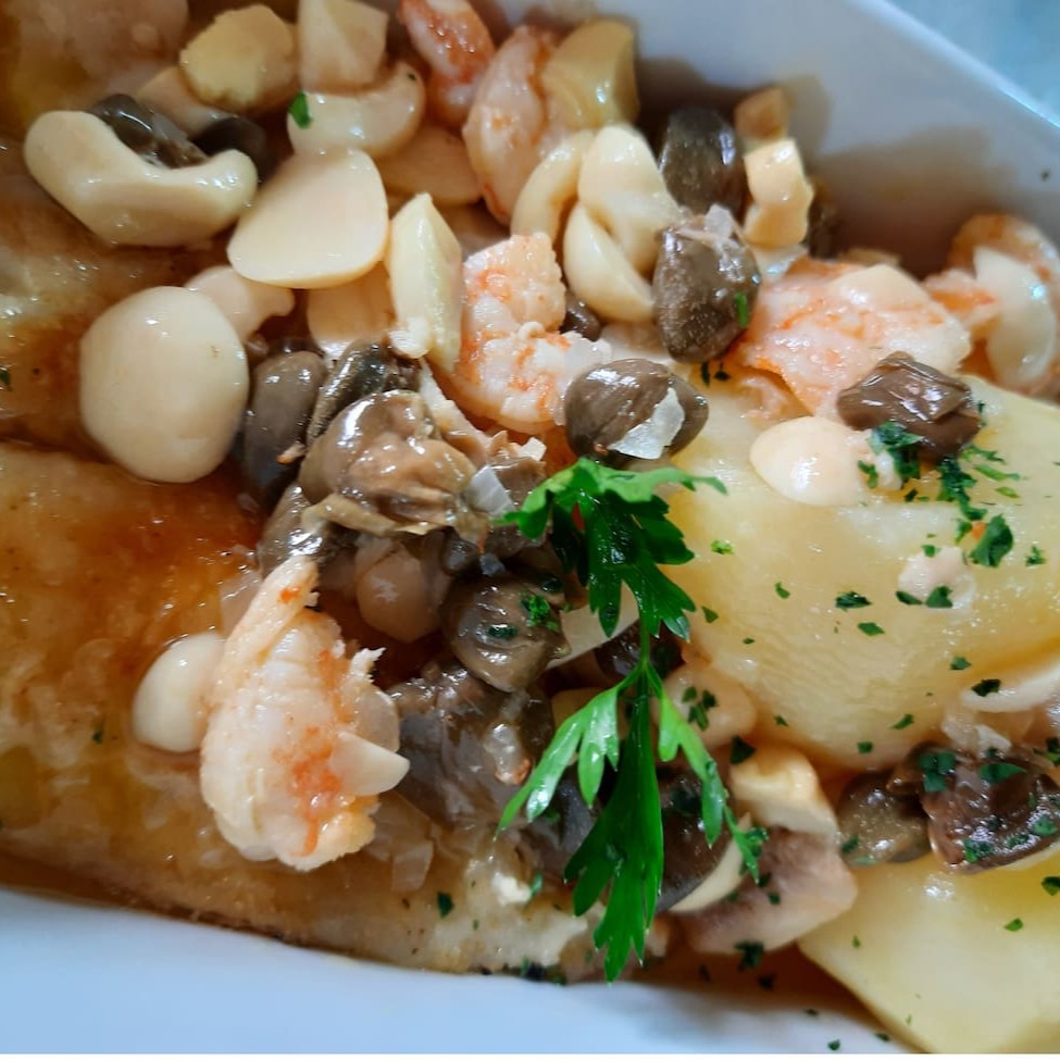 Linguado grelhado ao molho de alcaparras, camarão e cogumelos servido com batata cozida. Serve 2 pessoas.