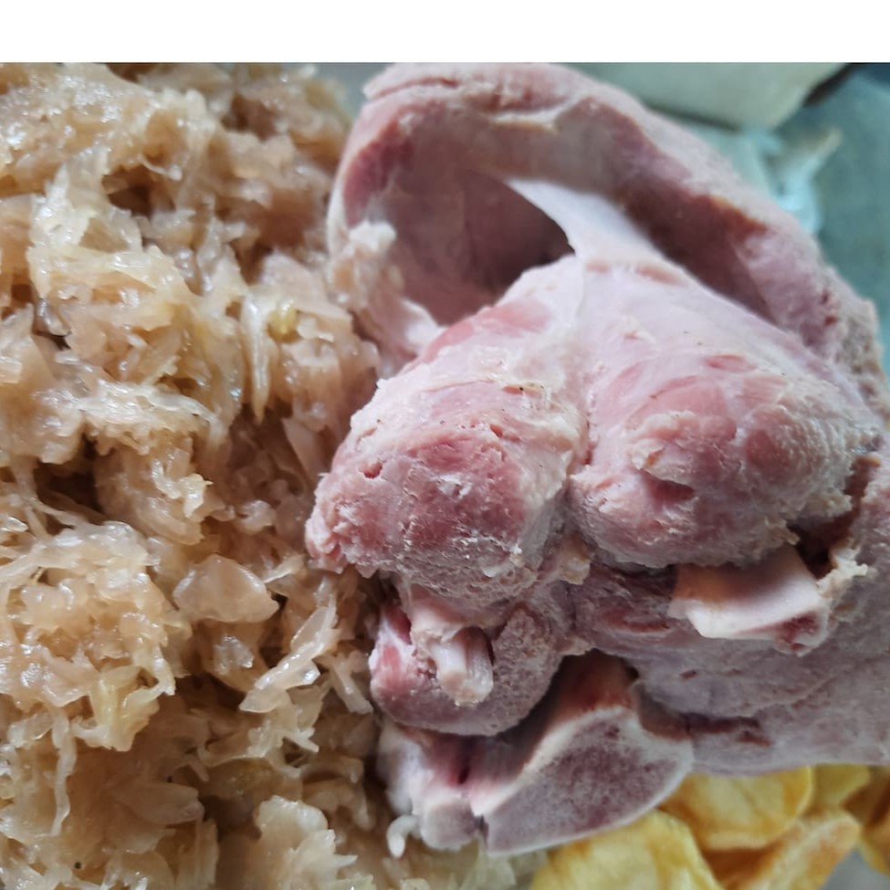 Joelho de porco cozido, guarnecido com chucrute e batata cozida. Serve 2 pessoas