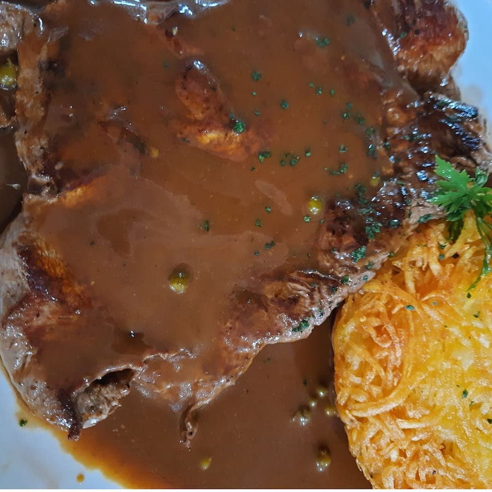 Filé mignon grelhado ao molho de pimenta verde e servido com batata rosti. Serve 2 pessoas