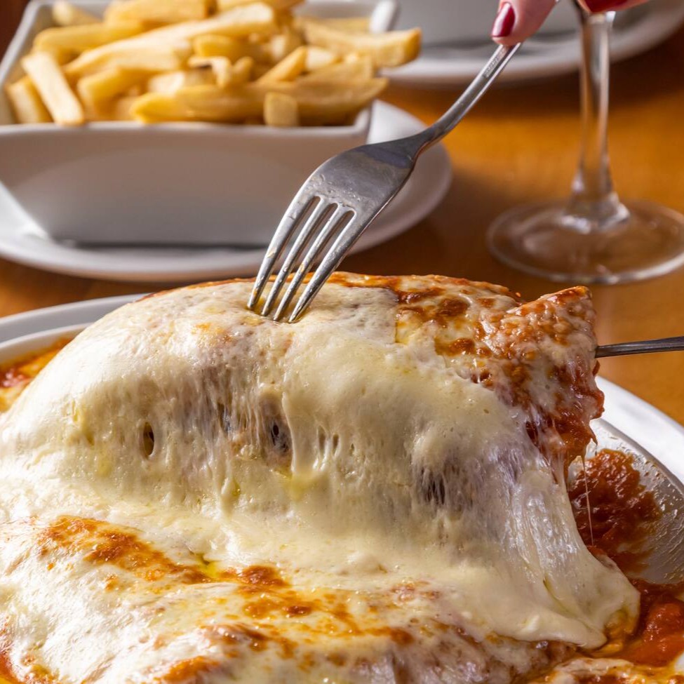Filé Mignon à milanesa, gratinado ao molho de tomate e queijo servido com arroz e fritas.