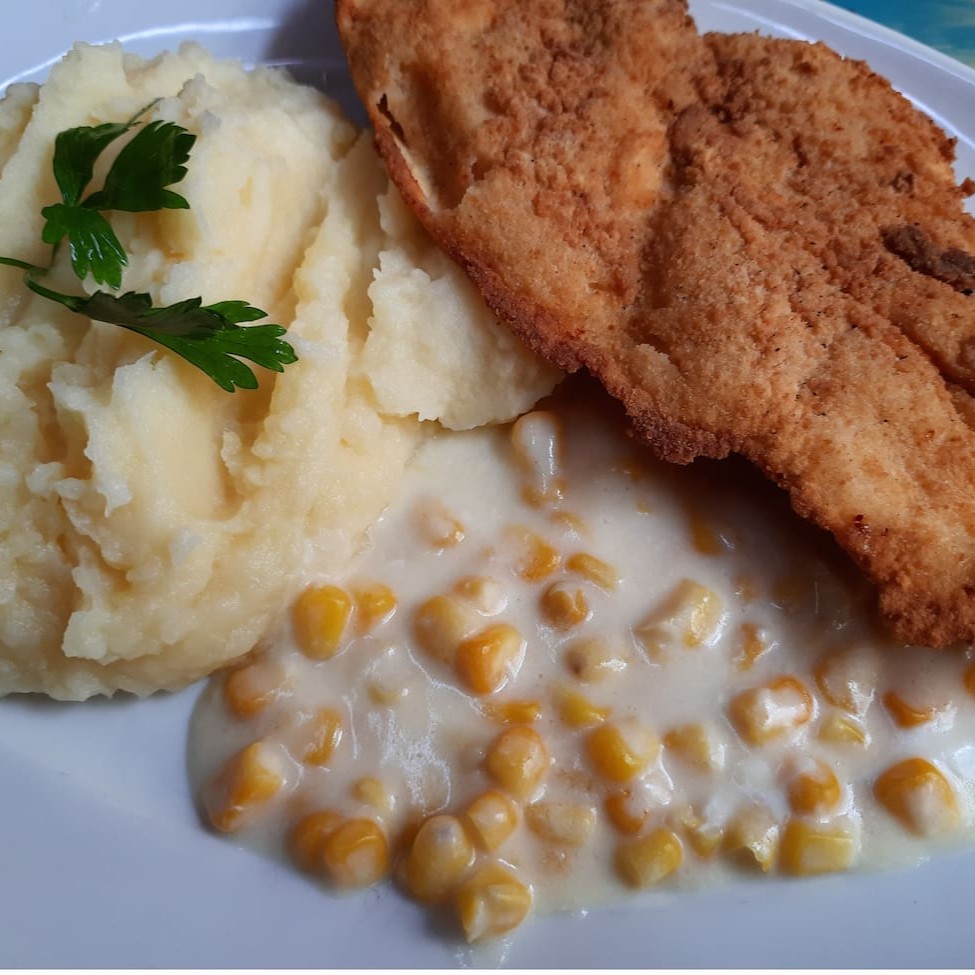 Peito de frango à milanesa com creme de milho e purê de batatas.