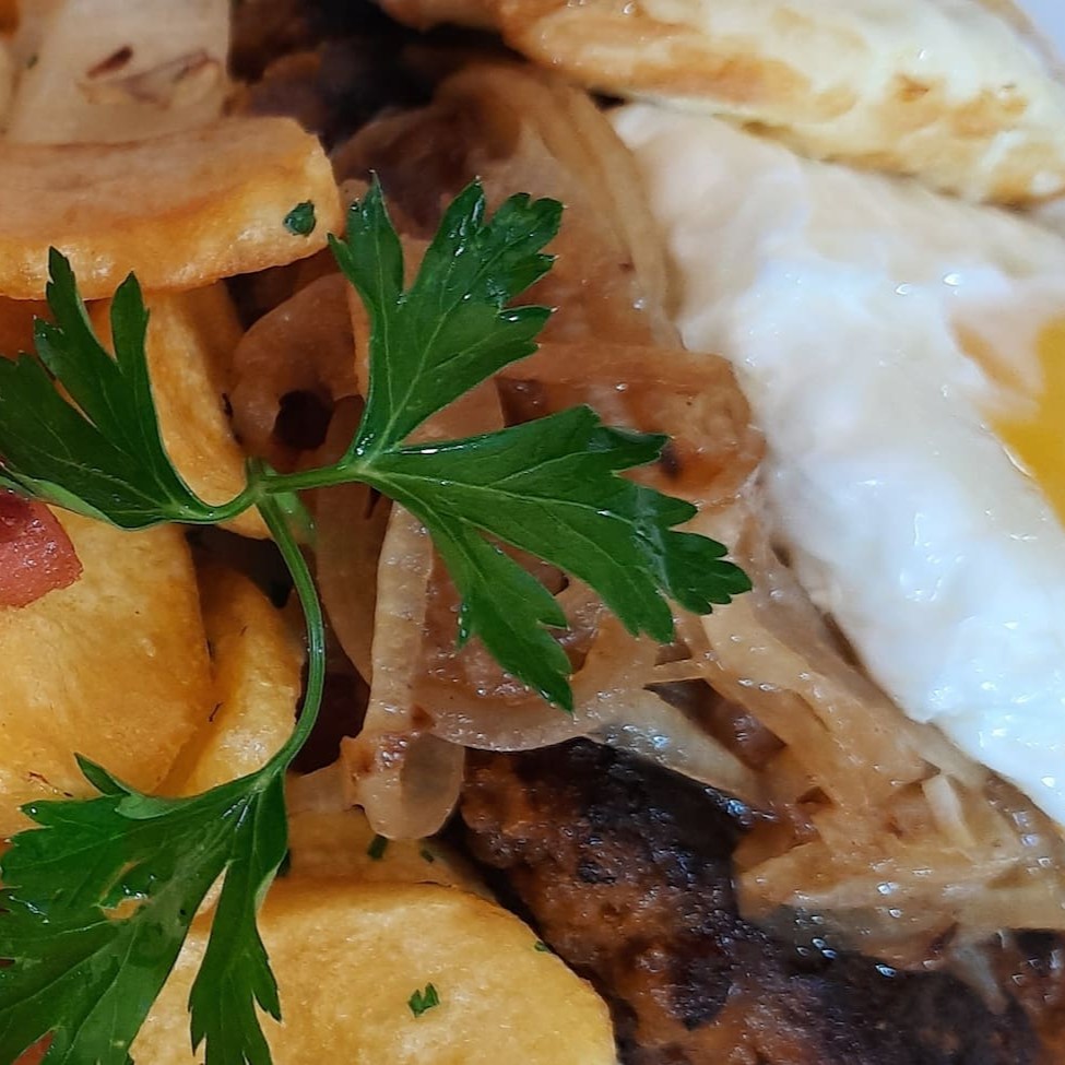 Hambúrguer de carne condimentada grelhado guarnecido com ovo frito, cebola dourada e batata dourada, bacon e cebola