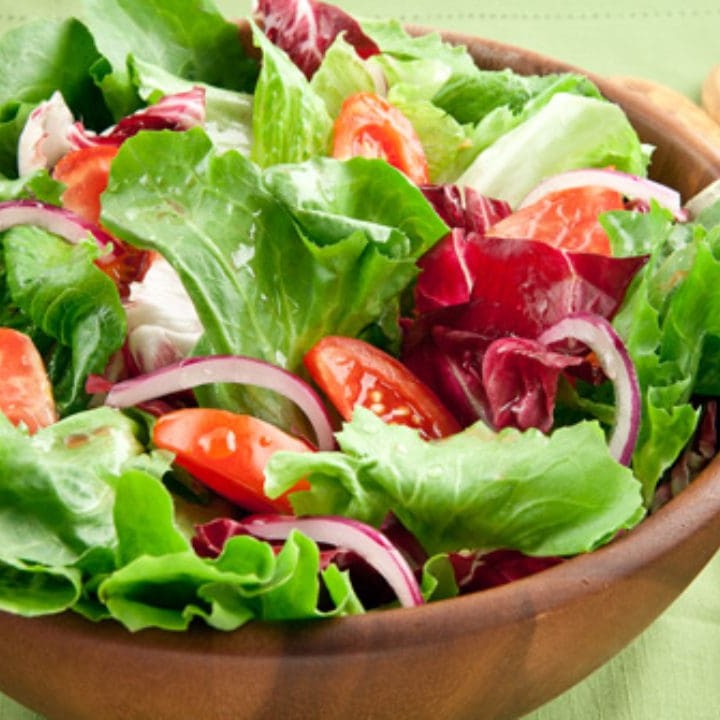 Mix de folhas verdes com tomates , azeitonas e cebolas. Acompanha molhos , azeite e vinagre.