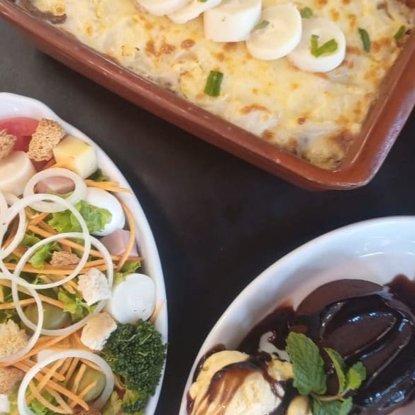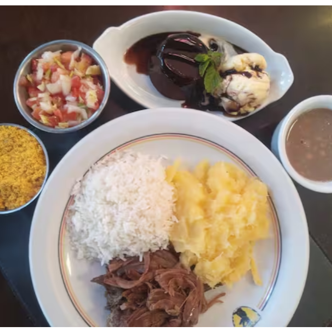 Costela no bafo, mandioca cozida, arroz, feijão, farofa e vinagrete. Acompanha 1 Petit Gateau com Sorvete de Creme