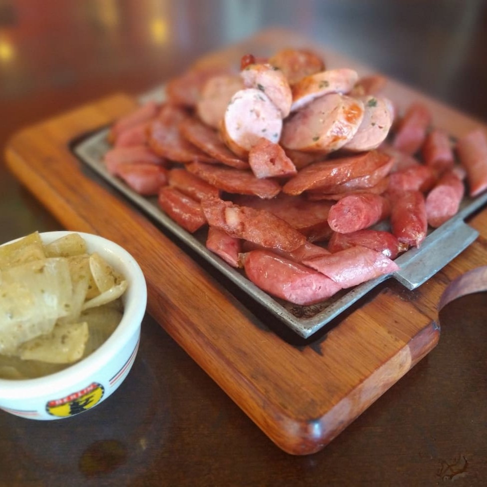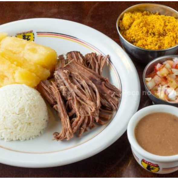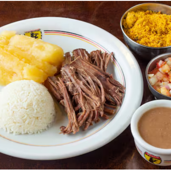 Linguiça Assada (200g), Arroz Branco (170g), Feijão (130g), Mandioca Frita (150g) e Farofa e Vinagrete (150g) Serve 1 pessoa (750g)